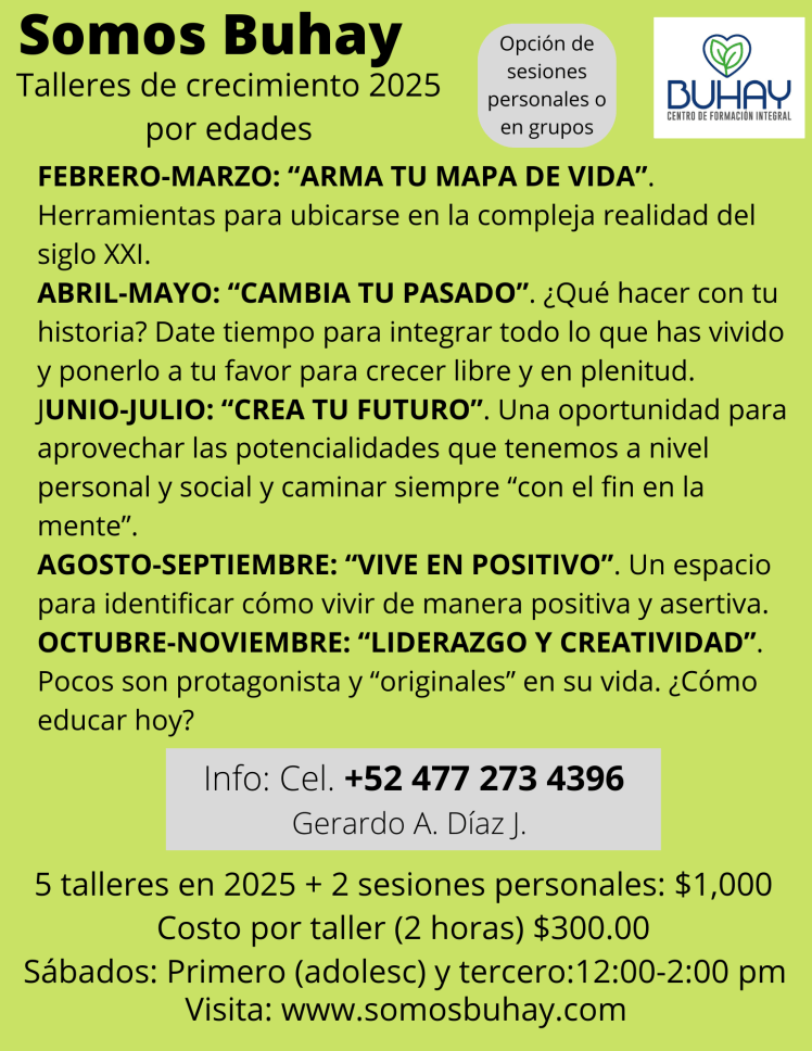 Estos talleres se imparten los primeros y terceros sábados de cada mes, pero pueden ser solicitados por al menos dos personas, familias en nuestra sede o para grupos más grandes (familias, escuelas, empresas…) en otras sedes. Solicitar info al +524772734396